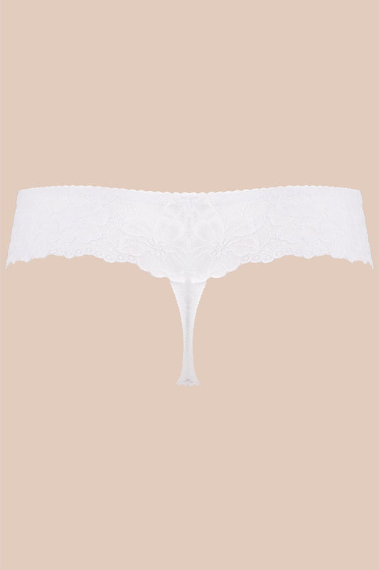 Subtle thongs in white colour. - fully made of smooth, shiny knitted fabric. - edges finished with wide lace - front decorated with satin bow. Cotton 7 % Spandex 15...